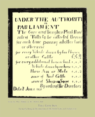 As illustrated to the right (click on it for a larger view), tolls in 1851 on one such area road were 6 pence for every vehicle "drawn by two horses or other cattle" plus or minus adjustments for mules, asses or whatever. One tollkeeper sometimes collected tolls by extending a half coconut(!) attached to a stick out to the travellers (especially when they were sitting way-y-y up on top of bales of hay).